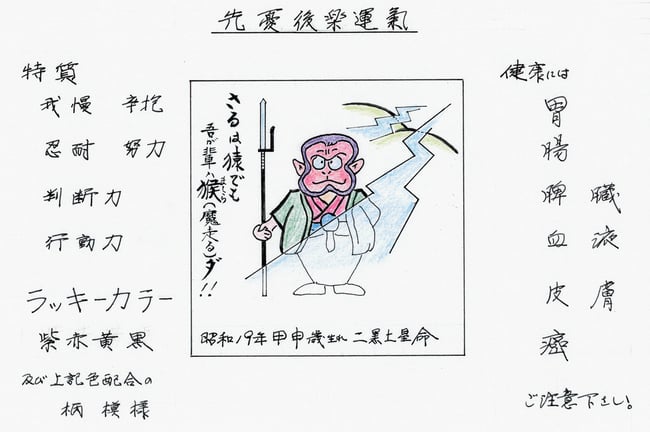 20日 2月 2015 六十干支「昭和19年 二黒土星 甲申歳」 この年の二黒は「グズの二黒」ではなかった。猿が「ましら」と呼ばれた時代に還って活躍しなければならなかった。 六十干支は塾生専用ページに開催中! 易たま tagPlaceholderカテゴリ: 翔氣塾 コメントをお書きください コメント: 0