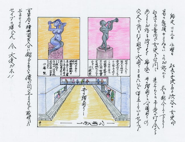 22日 2月 2015 漫歩径「師走の渋谷」 師走の22日水曜日 社長の交流のある渋谷の女史が易の勉強やってみたいとのお話から私を紹介して下さり、社長のご案内で女史を訪問し、来年からの予定を打合せをあらましお話を済ませて帰途。 井之頭通りと公園通りの交叉で角を引き廻し大通りをまたいで併立しているセイブ百貨店の横側面入口に飾られている像が目に止まったので取材した。 それにしてもセイブの堤さん、今、大変だネ!! 星翔 tagPlaceholderカテゴリ: 翔氣塾 コメントをお書きください コメント: 0