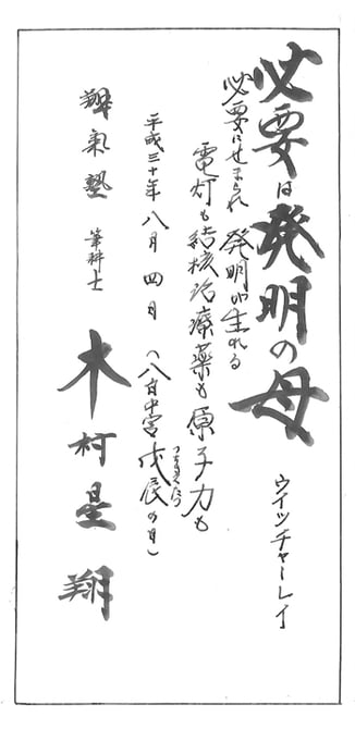 05日 8月 2018 星翔から:必要は発明の母 【必要は発明の母】 ウイツヤーレイ 必要にせまられ 発明が生まれる 電灯も結核治療薬も原子力も・・・・・ 星翔にとって、必要だった。 電灯・・・・・筆耕するときに全体のバランスとるために 使っていた。 文字を書く人生にとって、もっとも必要だった(笑) 結核治療薬は一人目の妻は、結核だった。 終戦後の何もない時代・・・・高額すぎて苦しめられた。 原子力は広島原爆被害は彼の人生を大きく変えた。 きっと、そんなことを思いつつ書いたのでしょう(笑) tagPlaceholderカテゴリ: 翔氣塾, 星翔、今日の書